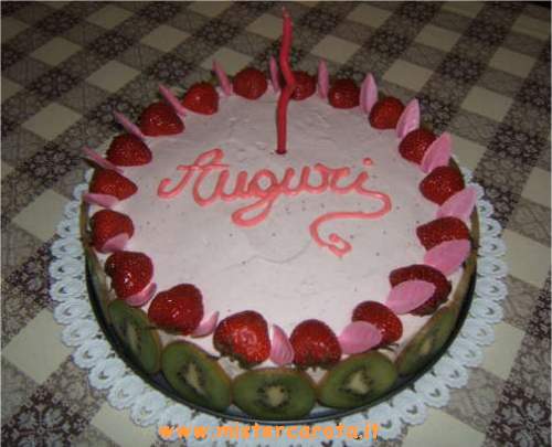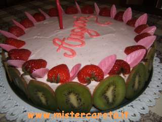 Ho liberato la torta dallo stampo e ho decorato il bordo con fettine di kiwi e sopra con fragoline.