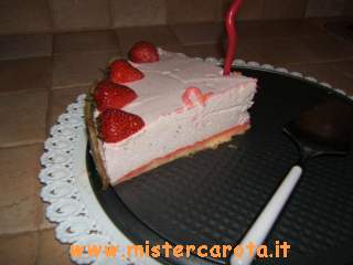 Ho rivestito la base di uno stampo ad anello apribile con la pasta biscotto, l'ho bagnato con dello sciroppo alla fragola, ho versato la mousse e messo in frigo per due ore.