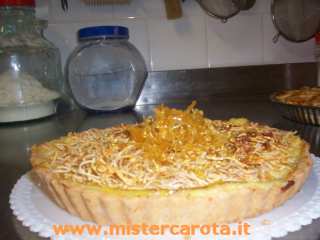 Ingredienti per 10-12 persone: 400 gr di pasta frolla - 400 gr di crema pasticcera - 200 gr di tagliolini freschi e un po' seccati a nido (fatti con farina e uova e tagliati fini) - succo e buccia grattugiata di limone o anche di arancia - una spruzzata di liquore a piacere (facoltativa) - 2 cucchiai di zucchero a velo - caramello (100 gr di zucchero, qualche cucchiaio di acqua).