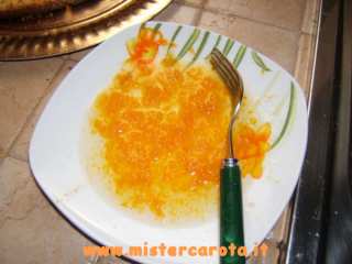 Ingredienti: 2 uova - 240 gr di zucchero - 120 gr di burro fuso - 1 cucchiaino di rum - 250 gr di carote tritate finemente (io ho comperate quelle a julienne e poi le ho sminuzzate con le forbici, sembrano più asciutte e fanno meno acqua) - 50 gr di mandorle tritate fine - 250 gr di farina setacciata - 1 bustina di lievito per dolci - latte q.b.
