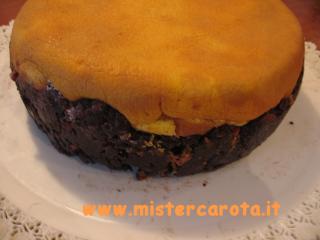Quindi per renderla regolare l'ho lasciata nella teglia e ho coperto la parte superiore con uno strato di impasto di dolce salame, livellando e premendo per bene, e spingendolo pure negli spazi tra la torta e la teglia. Ho messo in frigo per qualche ora per far indurire. Poi ho capovolto la torta e la parte coperta con l'impasto del dolce salame ne è diventata la base.