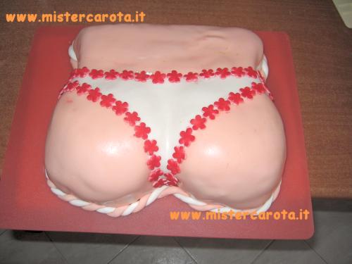 Ho avvolto nella pellicola trasparente e in frigorifero. Il pomeriggio successivo con un coltellino ho ritagliato seguendo il pan di spagna sagomato ho ricoperto di panna montata e poi di pasta di zucchero rosa. Successivamente è stata la volta della lingerie sulla quale ho messo i fiorellini rossi.