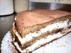 Tagliare il Pan di Spagna in 3 dischi, bagnare il primo con il caffè, dopo averlo messo su un vassoio, fare uno strato con metà della crema, spolverare con il cacao, mettere il secondo disco, bagnare e mettere il resto della crema.