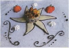 Nella foto, la preparazione è stata eseguita sciogliendo del cioccolato e, quando quasi tiepido, con l'aiuto di una tasca da papsticcere fatta con carta oleata, ho formato prima una stella e dopo intorno delle altre decorazioni di fantasia, arricchendo il tutto con delle fragoline o altri frutti di bosco e, perché no, anche con dei riccioli di panna fresca montata (anche spray).