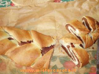 Amalgamate la farina con le uova, lo zucchero, il burro precedentemente fuso, e il lievito sciolto in poco latte tiepido fino a formare un impasto omogeneo. Lasciare lievitare al riparo dalla corrente per un'ora circa. Stendete l'impasto con il mattarello in una sfoglia sottile, ricavatene tre rettangoli di circa 16 x 50 cm (regolatevi comunque con la grandezza della vostra teglia da forno).