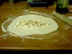 Prendete un po di pasta e tiratela a rettangolo, farcitela con il formaggio,