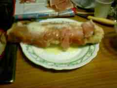 Chiudete il fornetto e poi continuate la cottura a forno aperto, capovolgendo ogni tanto il tronchetto. Appena cotto, mettetelo nel piatto, farcitelo con le fette di prosciutto,