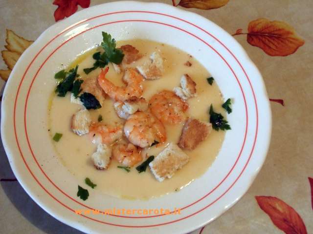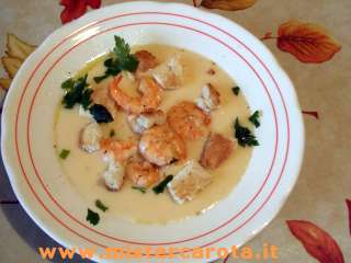 Ingredienti: 300 gr di mazzancolle - 700 gr di patate - 3 porri - 1/2 lt di latte - 50 gr di burro - 2 cucchiai di olio extravergine d'oliva - 1 mazzetto di prezzemolo - sale - pepe - pane in cassetta.