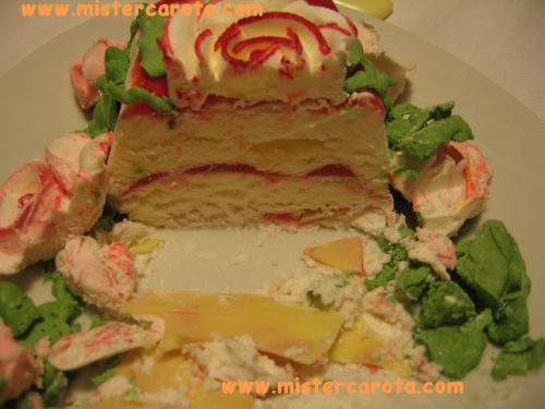 Mentre la meringa era in congelatore, frullare le fragole con il frullatore ad immersione, metterle in una casseruola con lo zucchero, toglierle dal fuoco prima che raggiungano il bollore e aggiungere la gelatina precedentemente amollata in acqua fredda.