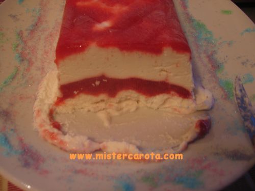 Versare uno strato di semifreddo, aggiungere uno strato di foglie di cioccolato bianco, un'altro strato di semifreddo, uno strato di fragole, strato di semifreddo, strato di cioccolato bianco e per finire strato di semifreddo.