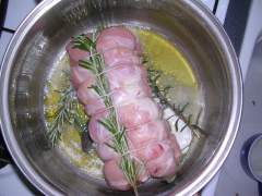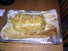 Cotto l'arrosto, cospargerlo leggermente di farina bianca per assorbire i liquidi interni di cottura, adagiarlo sulla pasta sfoglia, chiuderlo e spennellarlo con il tuorlo d'uovo.