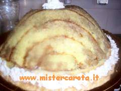Foderare con la pellicola trasparente uno stampo a cupola, o un'insalatiera, sistemare le fette di Pan di Spagna in modo da foderare tutto lo stampo.