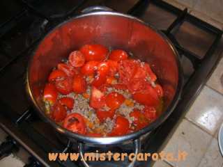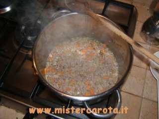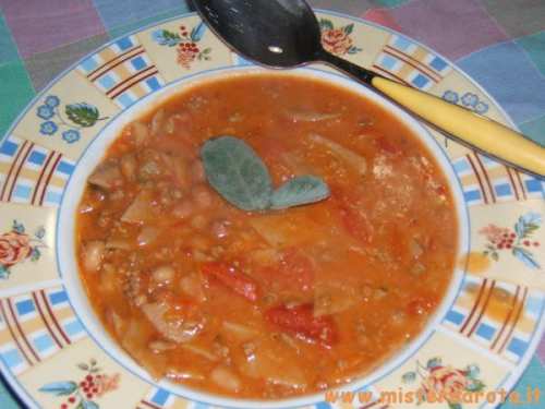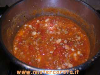 Ingredienti: 150 gr di carne macinata mista - 1 salsiccia - cipolla tritata - 1 carota tritata - 1 costa di sedano tritato - 1 spicchio d'aglio intero - erbe aromatiche miste (maggiorana, timo, basilico, salvia, peperoncino) - olio extravergine d'oliva - sale - pepe - 2 pomodori rossi - 1 peperone - 200 gr circa di passata di pomodoro - 250 gr di fagioli borlotti - 250 gr di fagioli cannellini (quelli già cotti nei barattoli) - vino bianco q.b. - acqua q.b.