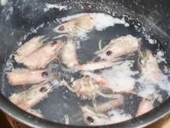 Pulite bene anche i gamberetti e mettete le teste e le chele a bollire in un bicchiere abbondante d'acqua.