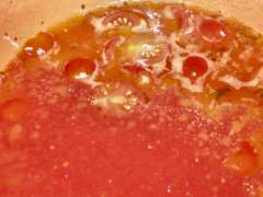 Fate soffriggere poi aggiungete la passata di pomodoro (meglio se fatta in casa), i pomodorini lavati e tagliati a metà e l'acqua di cottura degli scarti dei gamberi filtrata.