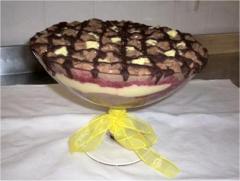 Comporre il dolce a strati nella coppa, cominciando con il pan di Spagna inzuppato di sciroppo, la crema bianca, poi di nuovo il pan di Spagna inzuppato, la crema al cioccolato, e cosi via fino a riempire la coppa, infine con una tasca da pasticcere coprire la superficie con mucchietti delle due creme rimaste, fare una griglia con il cioccolato fuso e riempire gli spazi con ciuffetti di panna montata.