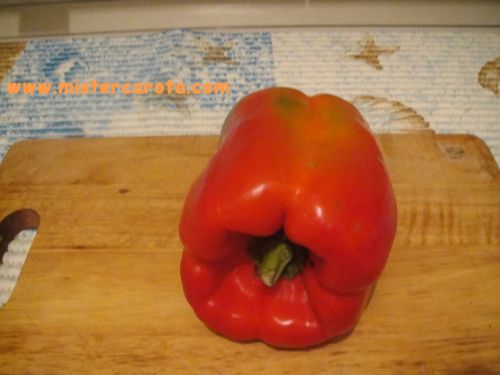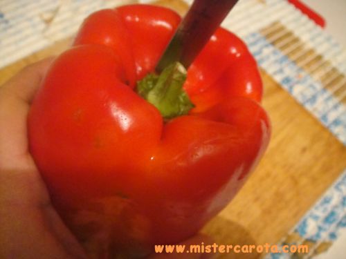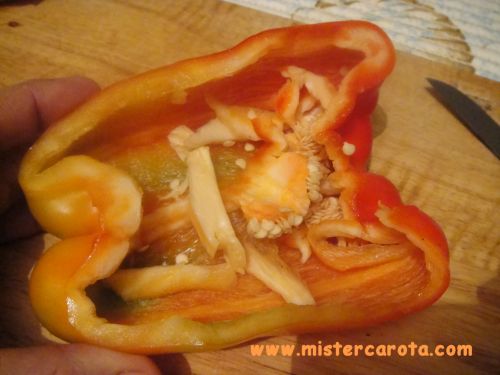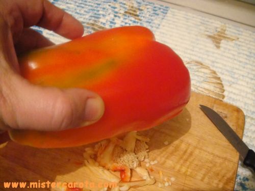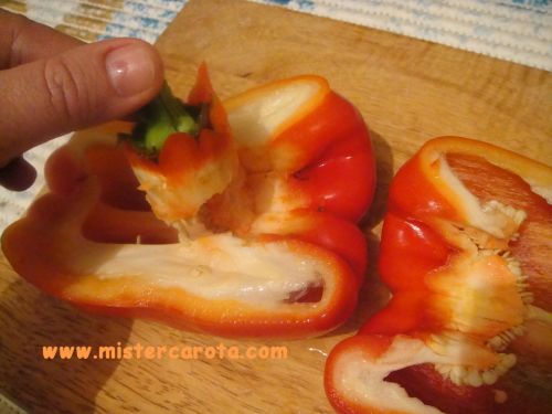 Girare il mezzo peperone e batterlo leggermente per far cadere i filamenti tagliati ed i semi.