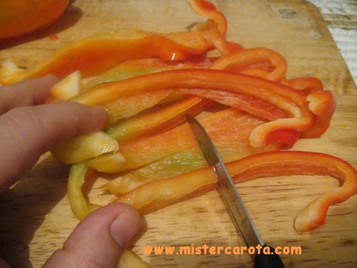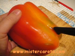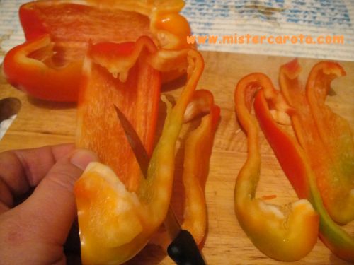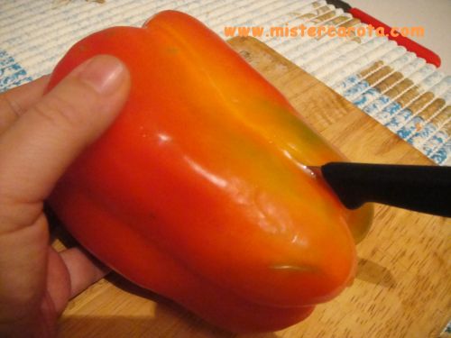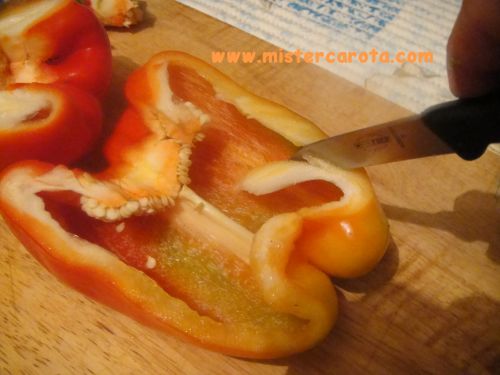 Tagliare con il coltellino i filamenti bianchi del peperone.