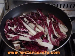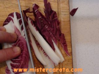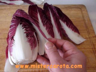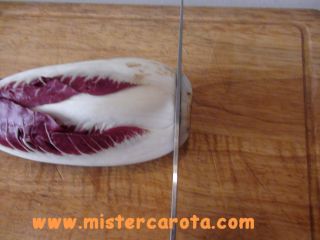 Tagliare il radicchio alla base eliminando la parte dura. Poi dividerlo in foglie.